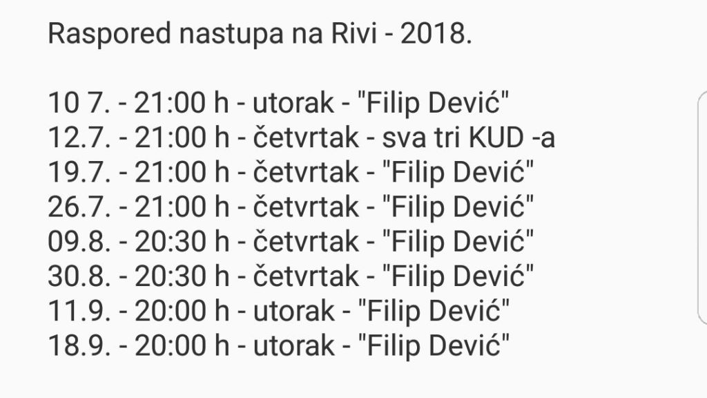 Dana 27.06.2018.god. mješovita klapa “Filip Dević” je na Peristilu, uz pratnju mandolinskog orkestra, izvela koncert s pjesmama sa proteklih splitskih festivala koje su oni pjevali ili su ih klapski obradili. Tom prigodom, kao gosti, su im se pridružile naša muška i ženska klapa sa po 2 svoje festivalske pjesme. Ambijent predivan, produkcija odlična, koncert samo […]